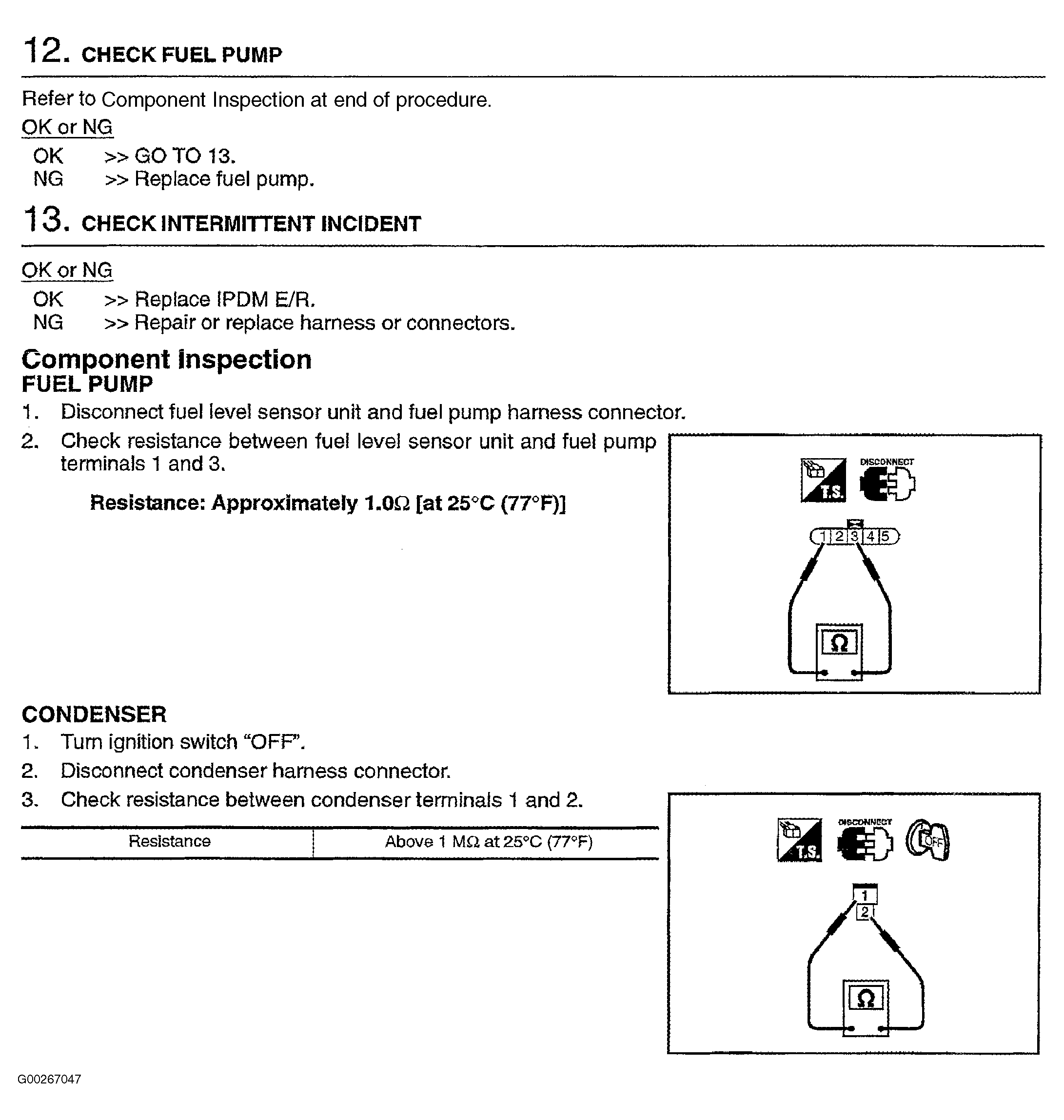 For fuel pump control system diagnosis and testing procedure, see Fig 2-Fig 5 . For fuel pump control circuit wiring diagram, see Fig 1. To check condenser, see FUEL SYSTEM CONDENSER . To check fuel pump, see FUEL PUMP . If no problem is indicated at this time, problem may be intermittent. See INTERMITTENTS in TROUBLE SHOOTING - NO CODES article. For component removal and installation procedures, see appropriate REMOVAL & INSTALLATION article.