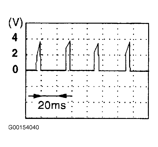 3. Let engine idle. Backprobing at ECM, connect an oscilloscope between ground and ECM terminal No. 1 (Purple/White wire) and read waveform signal voltage. See Figure and Figure . Compare waveform to waveform shown. See Fig 1. If waveform is the same, go to step  12. If waveform is not the same, go to step  7.
