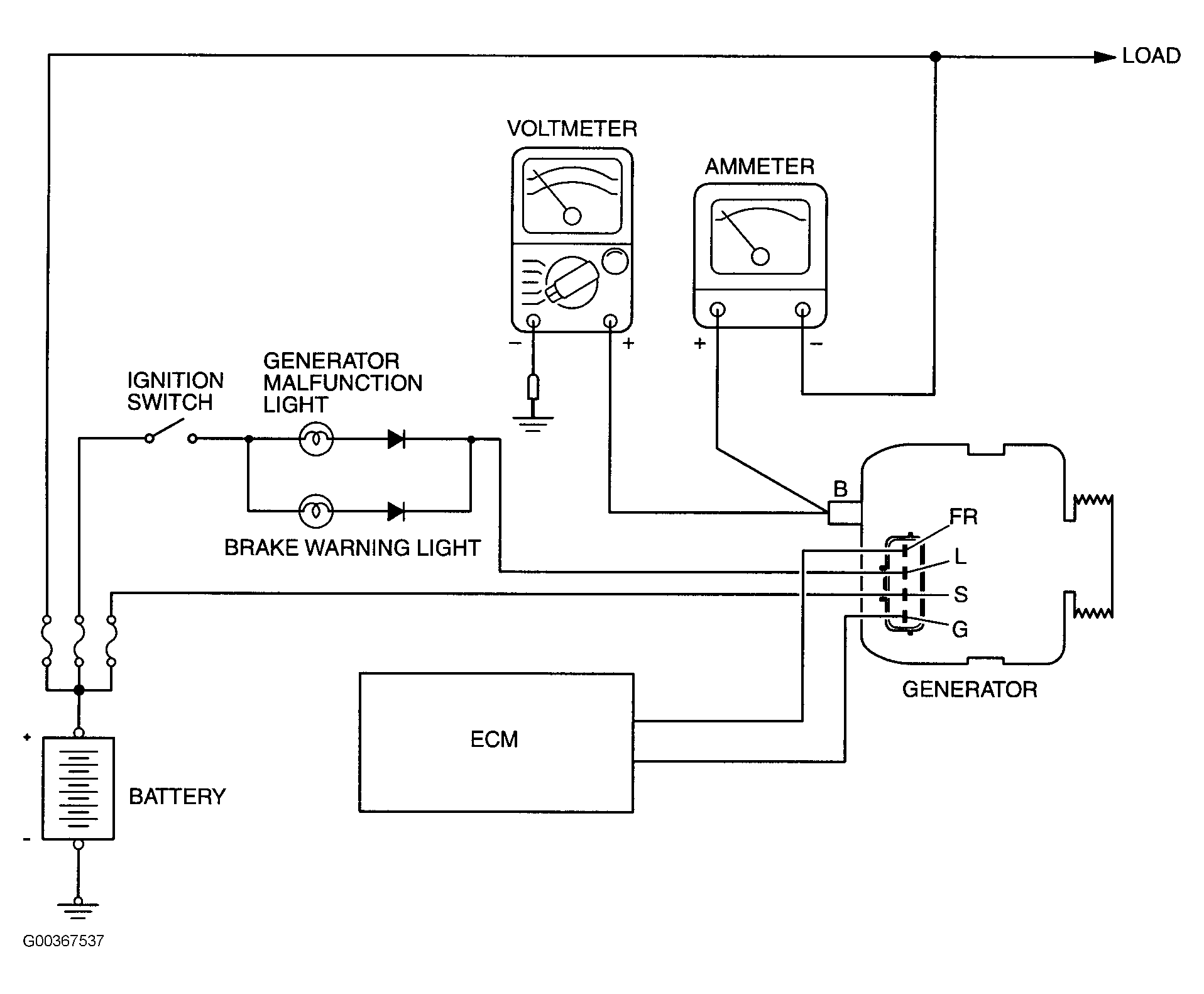 6. Connect a voltmeter with a range of 0-20V between the generator B terminal and ground. (Connect the positive lead of the voltmeter to the B terminal, and then connect the negative lead of the voltmeter to ground.)