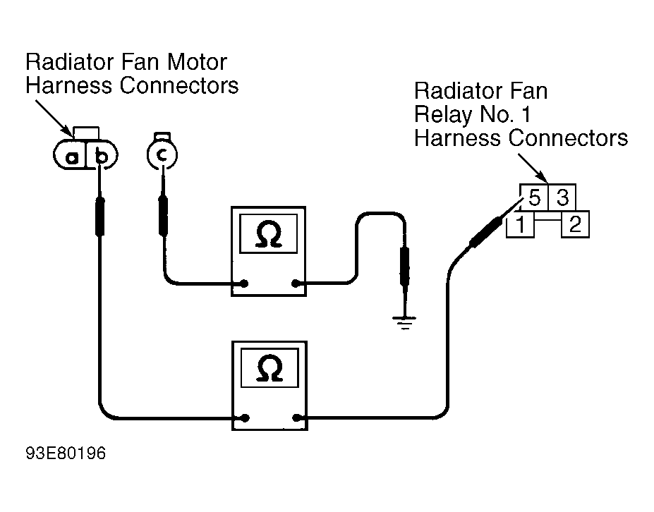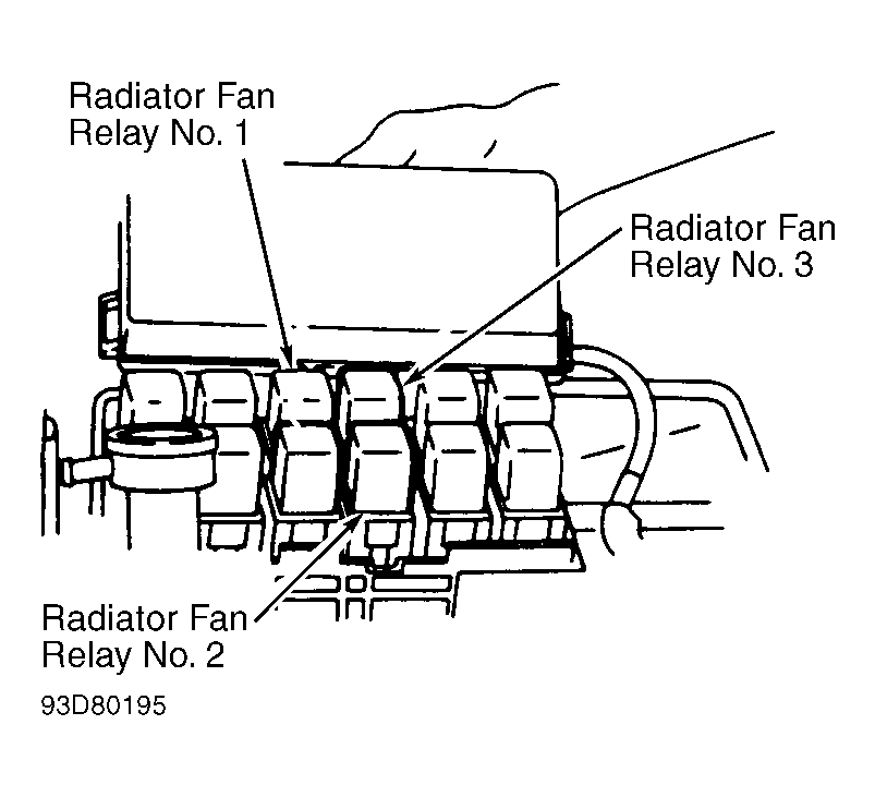 - Turn A/C and fan switches off. Turn ignition off. Disconnect radiator fan relays No. 1 and No. 2. See Figure and Figure . Start engine and idle until engine temperature is above 221°F (105°C). Ensure radiator fan operates at high speed. Reconnect radiator fan relay No. 2. Disconnect radiator fan relay No. 3. Start engine and idle until engine is above 221°F (105°C). Ensure radiator fan operates at high speed. If radiator fan does not operate at high speed in either test, see RADIATOR (COOLING) FAN HIGH SPEED CONTROL TEST (QUEST). If radiator fan operates at high speed, system is functioning properly.