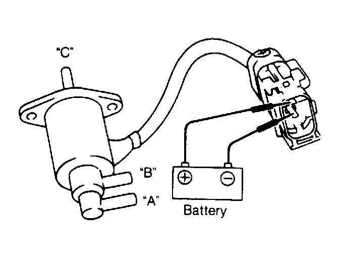 - Apply battery voltage across solenoid connector terminals, ensuring polarity is correct to prevent solenoid damage. Vacuum should now be available at port "A", but not at port "C". Replace solenoid if it does not operate as specified.