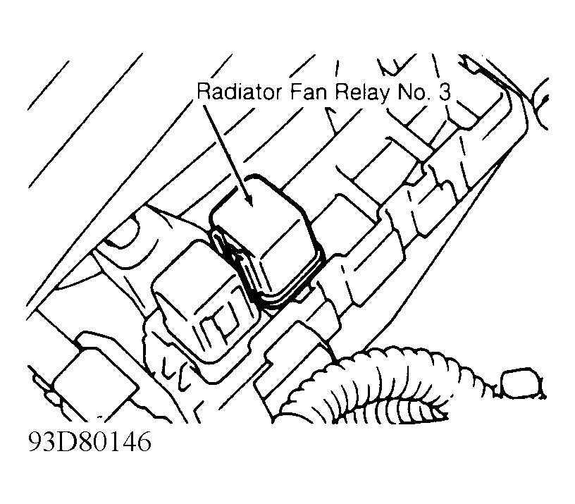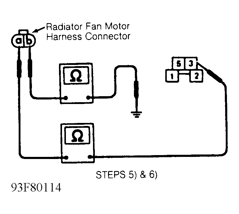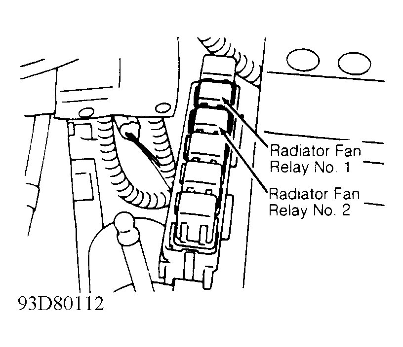 6. Check radiator fan relay No. 1. See RELAYS  under RELAYS & SOLENOIDS. Replace relay as necessary. If relay is okay, check fan motors. See RADIATOR FAN MOTOR TEST. Replace motor as necessary. If fan motor is okay, check ECM and ECM harness connector for damage, corrosion or improper connection. Repair as necessary.