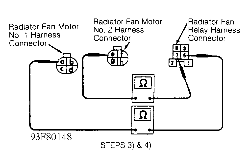 4. Check continuity between radiator fan motor No. 1 harness connector terminal "d" (Black wire) and ground. Check continuity between radiator fan motor No. 2 harness connector terminal "h" (Black wire) and ground. See Fig 1 -Fig 3 . Continuity should exist in all checks. If continuity exists in all checks, go to next step. If continuity does not exist in any check, repair open in appropriate wire or connector.