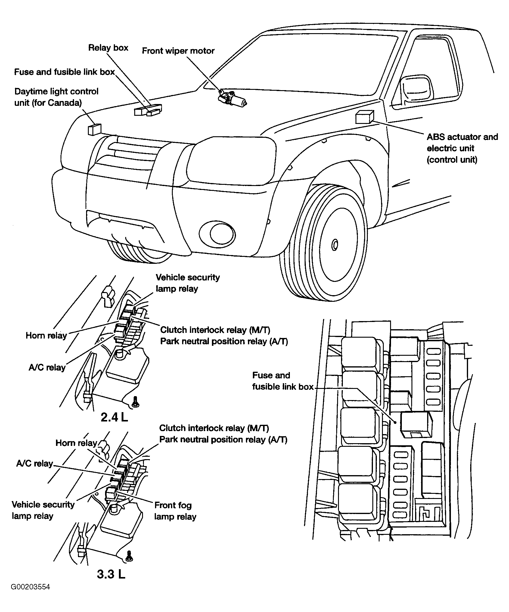 Fuse and fusible link box is located underhood. See Fig 3 . To identify components on fuse and fusible link box, see Fig 5 or Fig 6 .