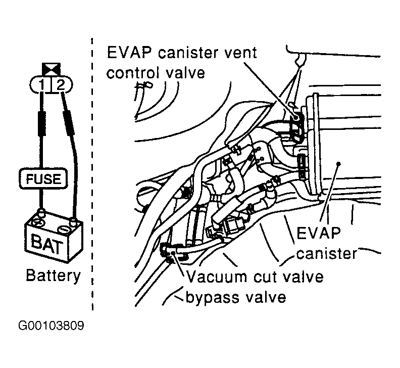 - Turn ignition off. Disconnect EVAP Canister Vent Control Valve (EVAP-CVCV) and vacuum cut valve by-pass valve harness connectors. See Figure . Using fused jumper wires, apply battery voltage to EVAP-CVCV and vacuum cut valve by-pass valve terminals. See Fig 1 . Apply 0.2-0.4 psi (1.38-2.76 kPa) of pressure to EVAP service port. DO NOT exceed 0.6 psi (4.12 kPa) of pressure. Remove pressure pump from EVAP service port. Using Leak Detector (J41416), locate EVAP system leak. See VACUUM DIAGRAMS article. If leak is found, repair as necessary. If leak is not is found, go to next step.