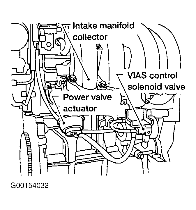 6. Turn ignition off. Check for cracks, clogging, poor or disconnected vacuum hoses and tubes between intake manifold and power valve actuator. If no problem is found, go to next step. If problem is found, repair or replace hoses as necessary.