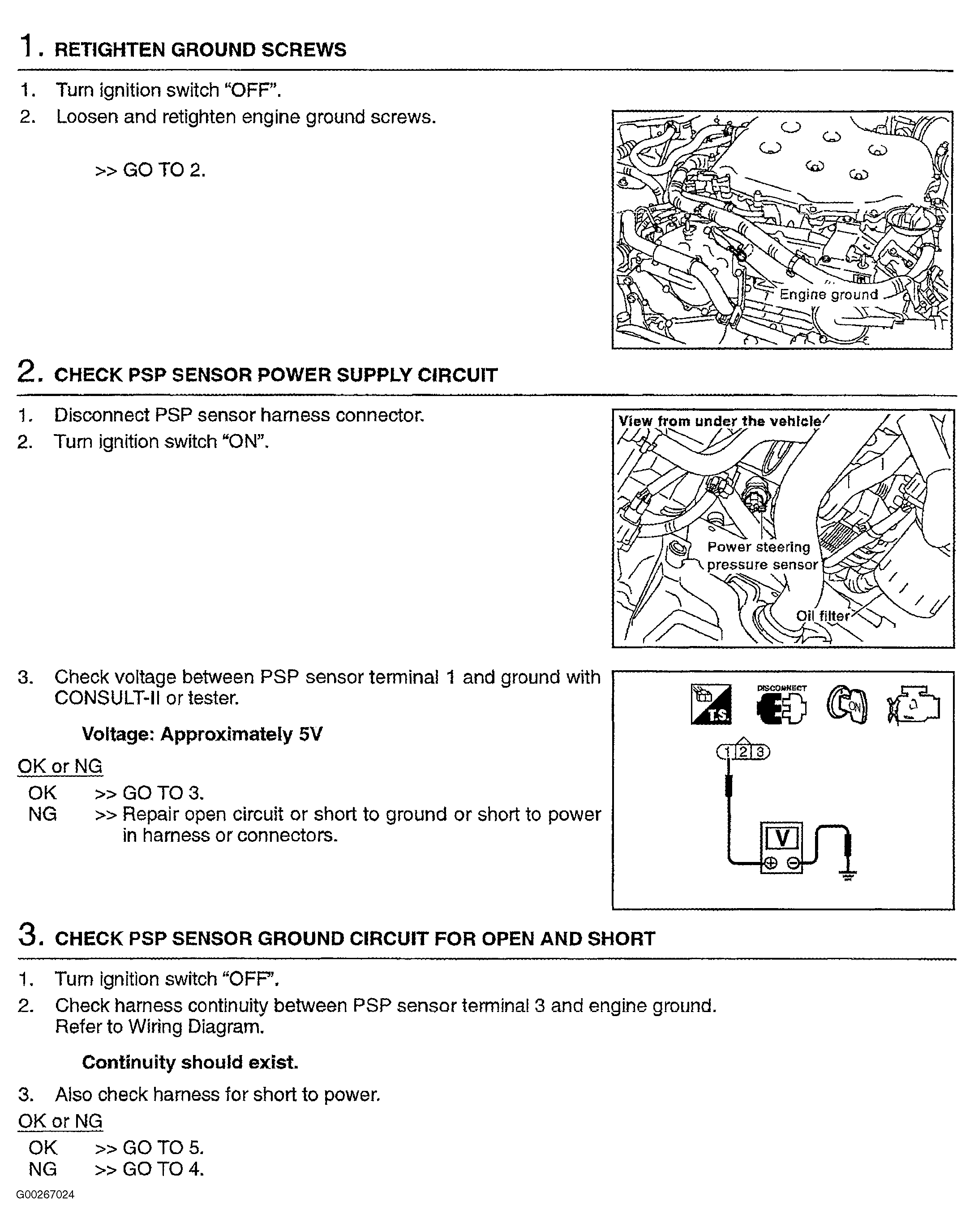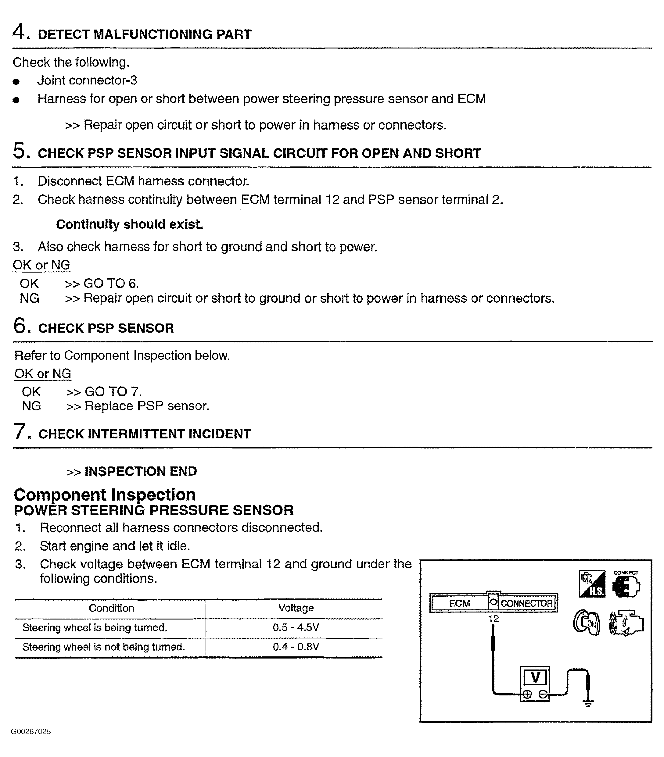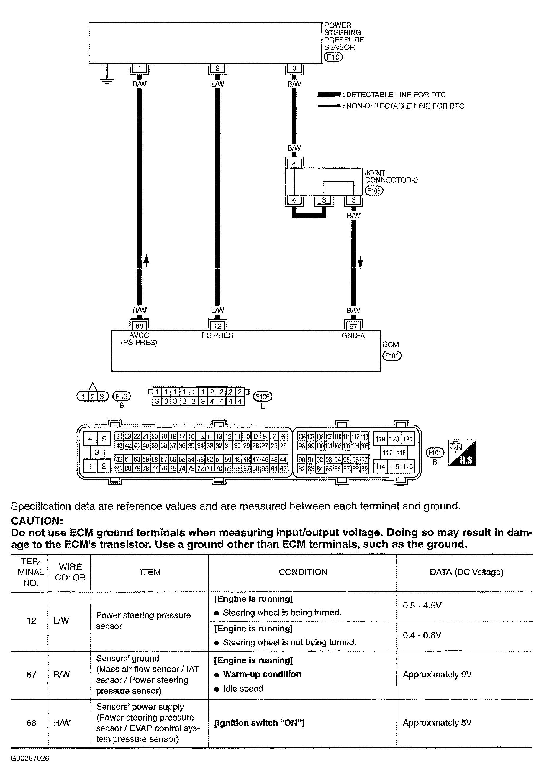 For test and diagnosis of power steering pressure switch, see Fig 1-Fig 2 . For locating power steering pressure switch and circuit wiring diagram, see Figure-Fig 3 . If no problem is indicated at this time, problem may be intermittent. See INTERMITTENTS in TROUBLE SHOOTING - NO CODES article. For removal and replacement procedures, see appropriate REMOVAL & INSTALLATION article.