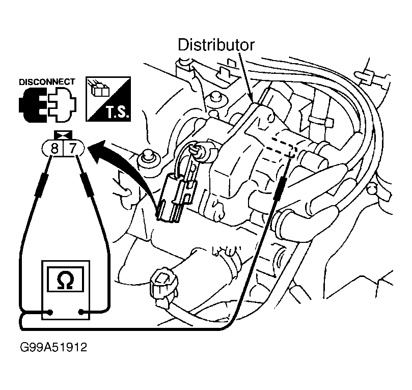 Ignition coil is located in distributor. Turn ignition off. Disconnect distributor 2-pin harness connector (ignition coil connector). Remove distributor cap. For primary coil, measure resistance between distributor 2-pin connector terminals (component side). For secondary coil, measure resistance between distributor 2-pin connector terminal No. 7 and coil tower. See Fig 1. See IGNITION COIL RESISTANCE (FRONTIER & XTERRA) table. Replace distributor assembly, if resistance is not as specified.