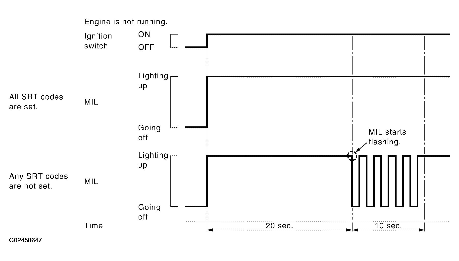 - When any SRT codes are not set, MIL will flash periodically for 10 seconds.