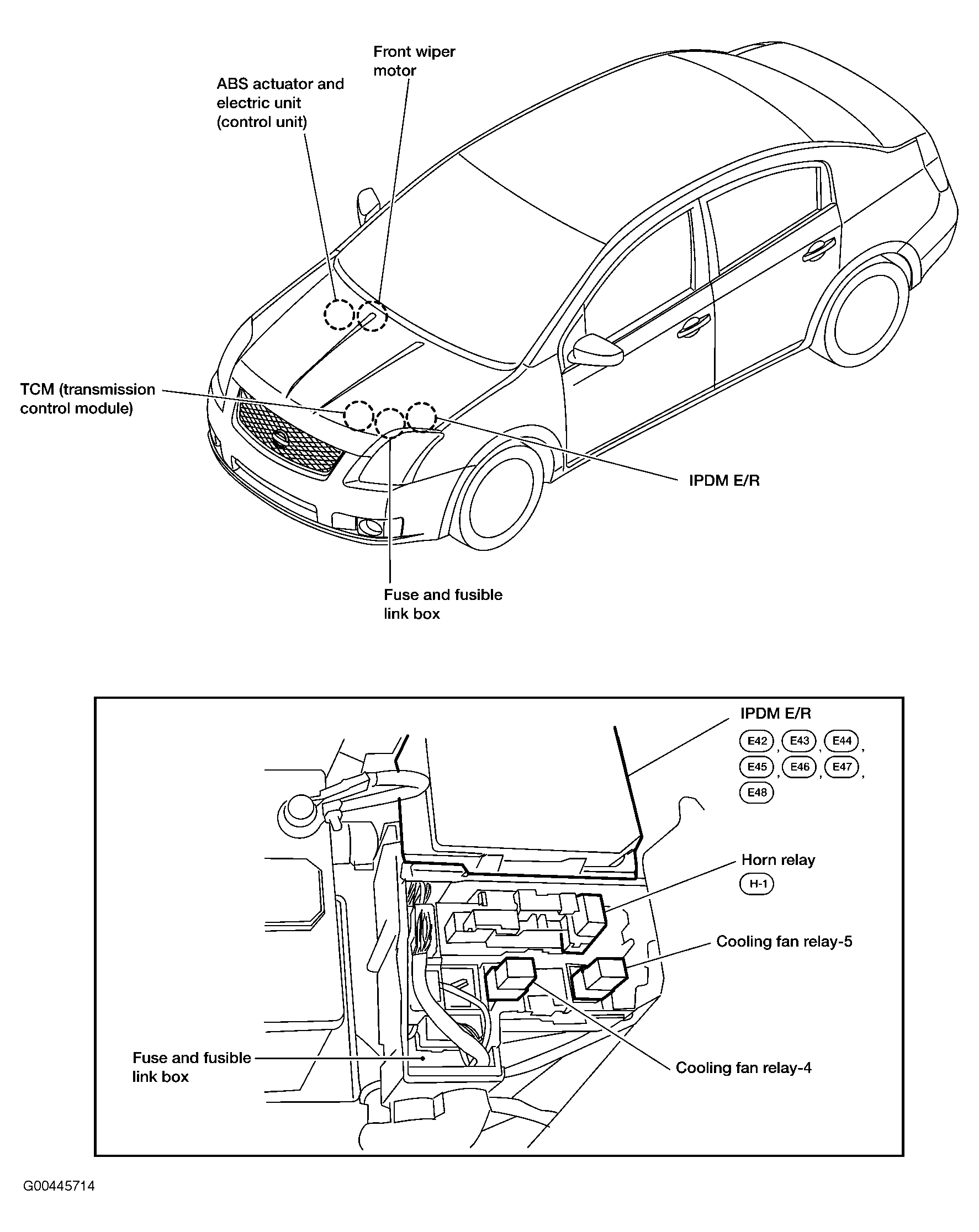 IPDM E/R (Intelligent Power Distribution Module Engine Room). Left front of engine compartment. See Figure.