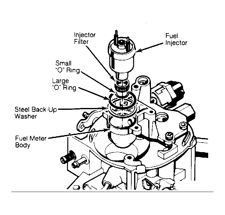- Lubricate "O" rings with automatic transmission fluid. Push small "O" ring on nozzle end of injector until seated against injector fuel filter. Install steel back-up washer in recess in injector cavity of fuel meter body. Install large "O" ring directly above back-up washer. Press "O" ring down in cavity recess until flush with top of fuel meter body casting surface. See Fig 1