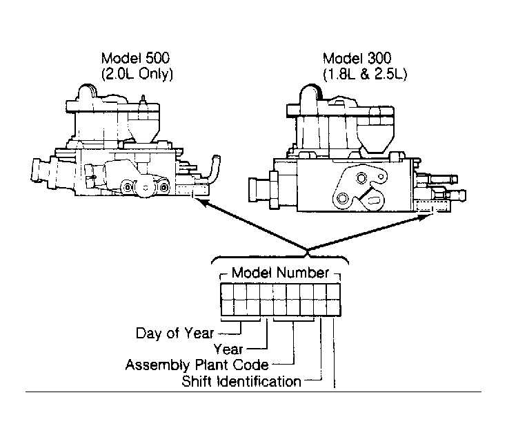 The throttle body identification number is "roll-stamped" on the mounting flange on the throttle lever side (Model 300) or Throttle Position Sensor side (Model 500) of the throttle body. See Fig 1 . Alphabetical code letters are stamped on the throttle body at external tube locations to identify vacuum hose connections.
