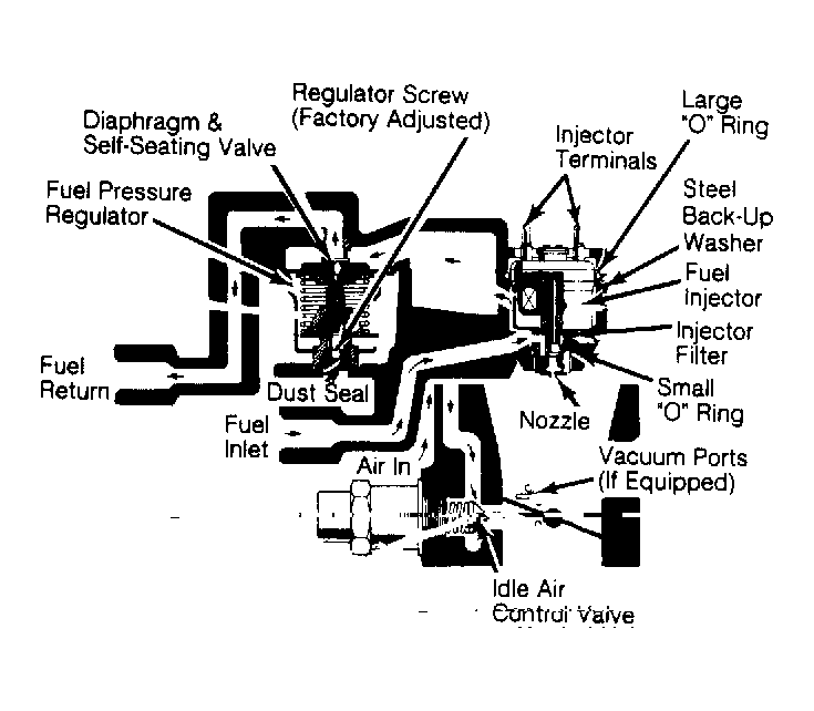 The throttle body injector (TBI) assembly is composed of 2 castings: a throttle body with a valve to control air flow and a fuel body with an integral pressure regulator and fuel injector. The throttle body casting may contain ports to generate vacuum signals for EGR valve, MAP sensor and canister purge system.