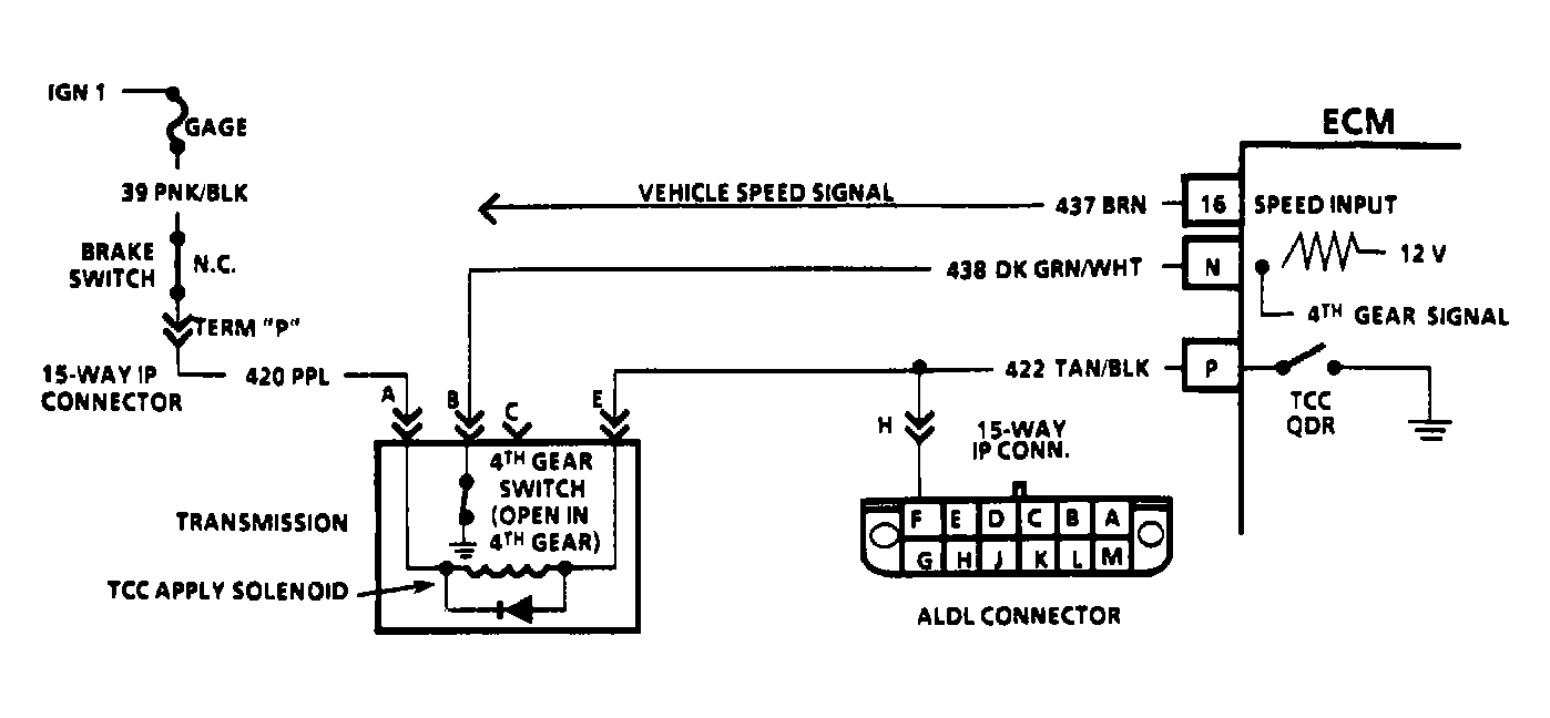 - Connect a test light to battery voltage. Touch TCC control driver terminal with test light. See Fig 1-86. Accelerate vehicle to 45 MPH and note test light. If test light does not illuminate, problem is a faulty ECM connector or ECM. On some models, lock-up signal may be checked at ALDL terminal "F" instead of at ECM terminal.