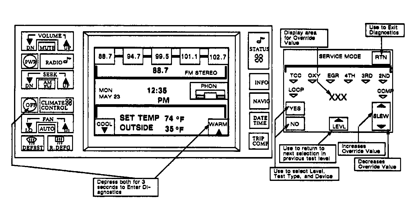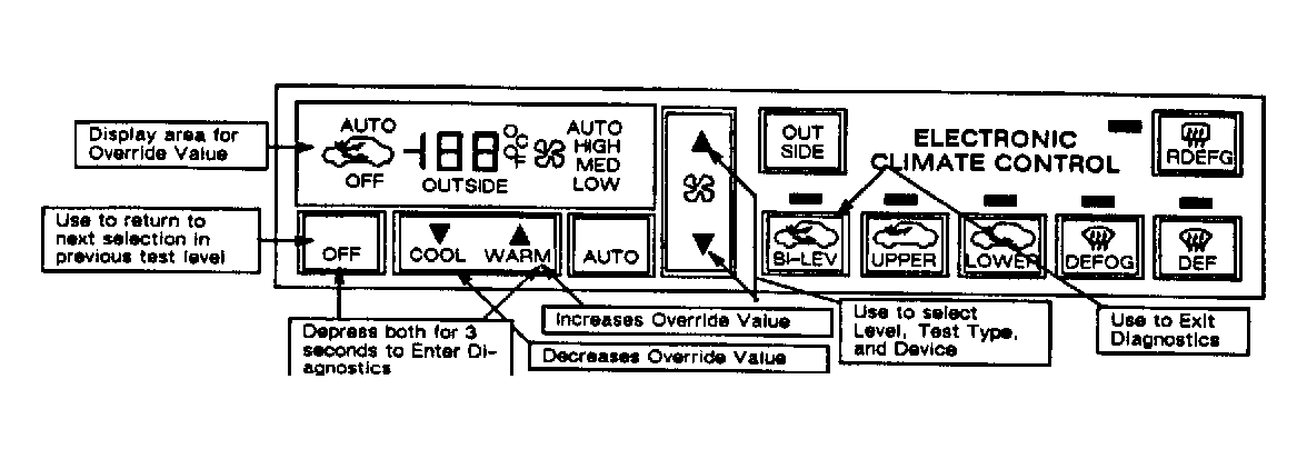 Override feature or test type is unique in that any other test type within selected system may be active at the same time. After selection of override test, pressing "LEVL" pad on CRT models or fan speed button on non-CRT vehicles, will allow selection of another test type. Control panel will continue to display selected override. When selecting another test type, it is possible to monitor effect of override on different vehicle parameters.
