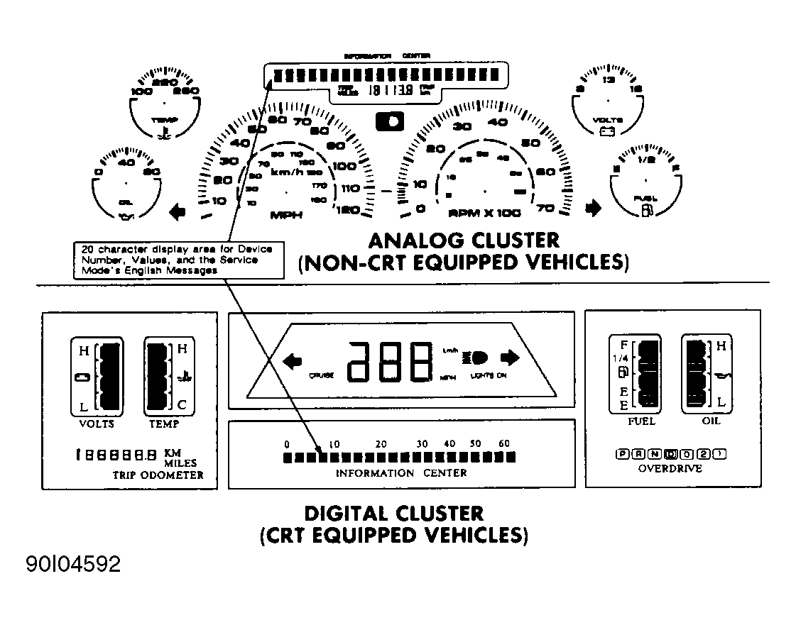 The service mode for diagnostic information incorporates a 20-character Driver Information Center (DIC) display. The DIC display is located on instrument panel cluster. When a malfunction is sensed by BCM computer system, one of the driver warning messages is illuminated on the DIC. When "service mode" is entered, data parameters, fault codes, inputs, outputs and other features such as override commands, snapshot and code clearing capabilities can be accessed and displayed through CRT or ECCP.