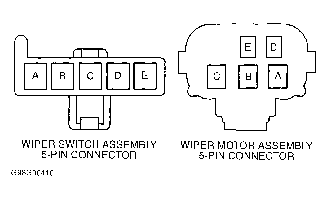 - Disconnect wiper motor 5-pin connector. Connect test light between ground and terminal "C" (Purple wire) at wiper motor 5-pin wiring harness connector. If test light is on, go to next step. If test light is off, check for open or poor connection in Purple wire between wiper/washer connector and wiper motor.