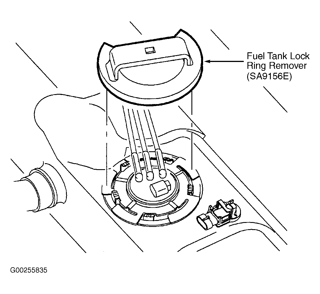 - Use the Fuel Tank Lock Ring Remover (SA9156E) and remove the fuel pump module retaining ring. See Fig 1. To prevent bending of the sending unit float arm during removal, lift the pump module up slightly to disengage the orientation tabs in the tank and rotate the module 90 degrees clockwise until the fuel lines are facing the 1 o'clock position. 12 o'clock is front of tank.