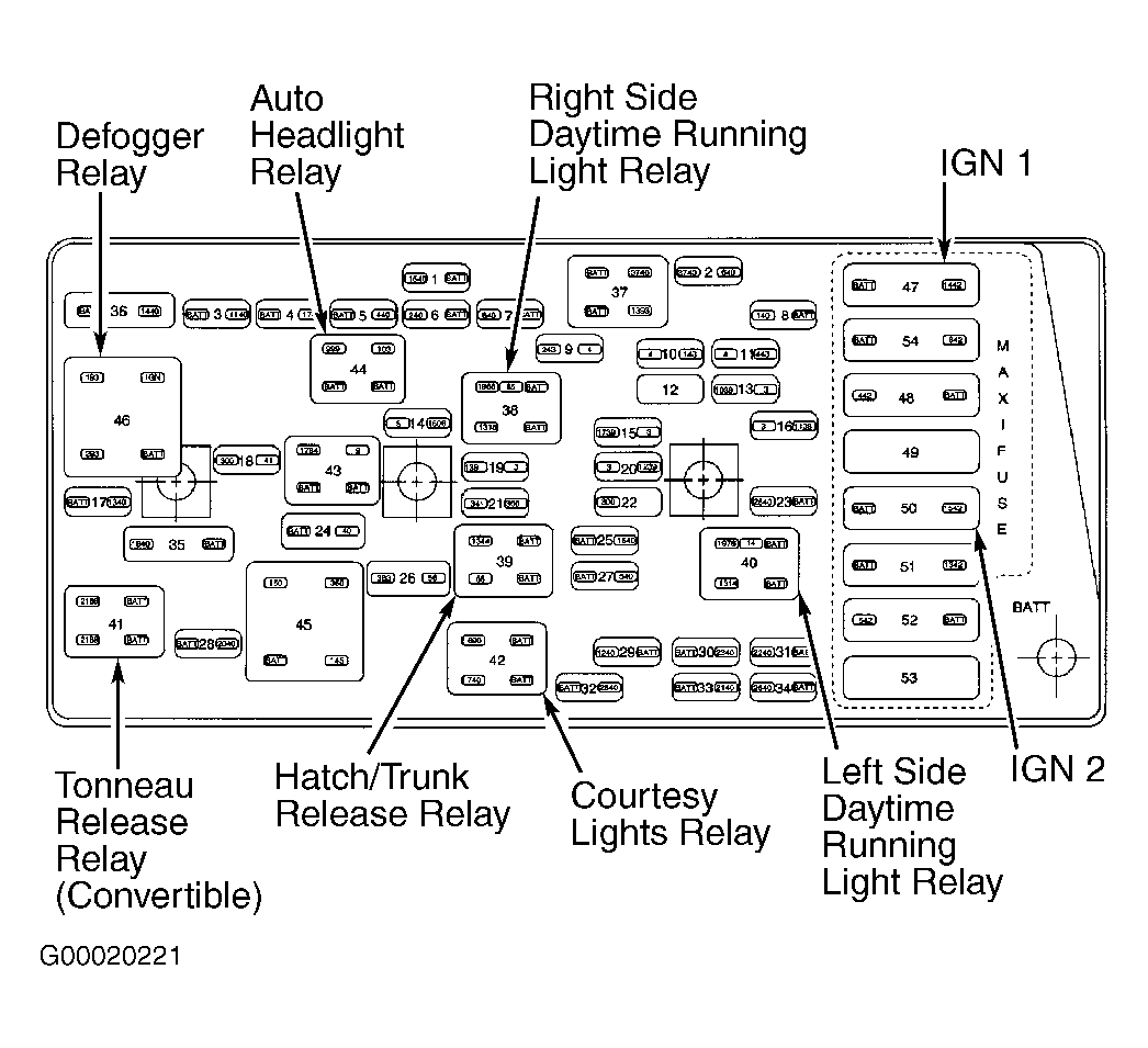 - Turn ignition off. Remove rear defogger relay from instrument panel electrical center. See Figure. Turn ignition on. Using a test light connected to ground, probe rear defogger relay IGN terminal at instrument panel electrical center. If test light comes on, go to next step. If test light does not come on, go to step 10.