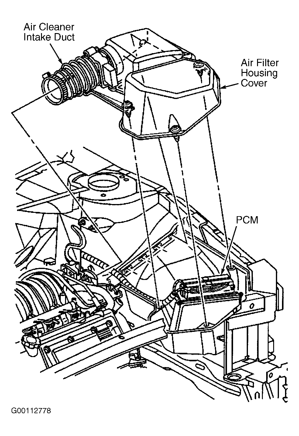 Record the Transaxle Fluid and Engine Oil Life Indexes from the Driver Information Center (DIC). Turn ignition off. Remove rear seat cushion to access battery. Disconnect the negative battery cable. Disconnect the Mass Airflow/Intake Air Temperature (MAF/IAT) sensor electrical connector. Loosen the intake air duct clamp at the throttle body. Loosen the air filter housing cover screws. Remove the air filter cover, the MAF/IAT sensor and the intake air duct. Disconnect both PCM connectors. Remove the PCM. See Figure.