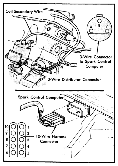 - Reconnect 10 pin connector to computer. Hold coil secondary wire 1/4" from ground and turn ignition "ON". Use jumper wire to momentarily touch pins "A" and "C" together and check the following: