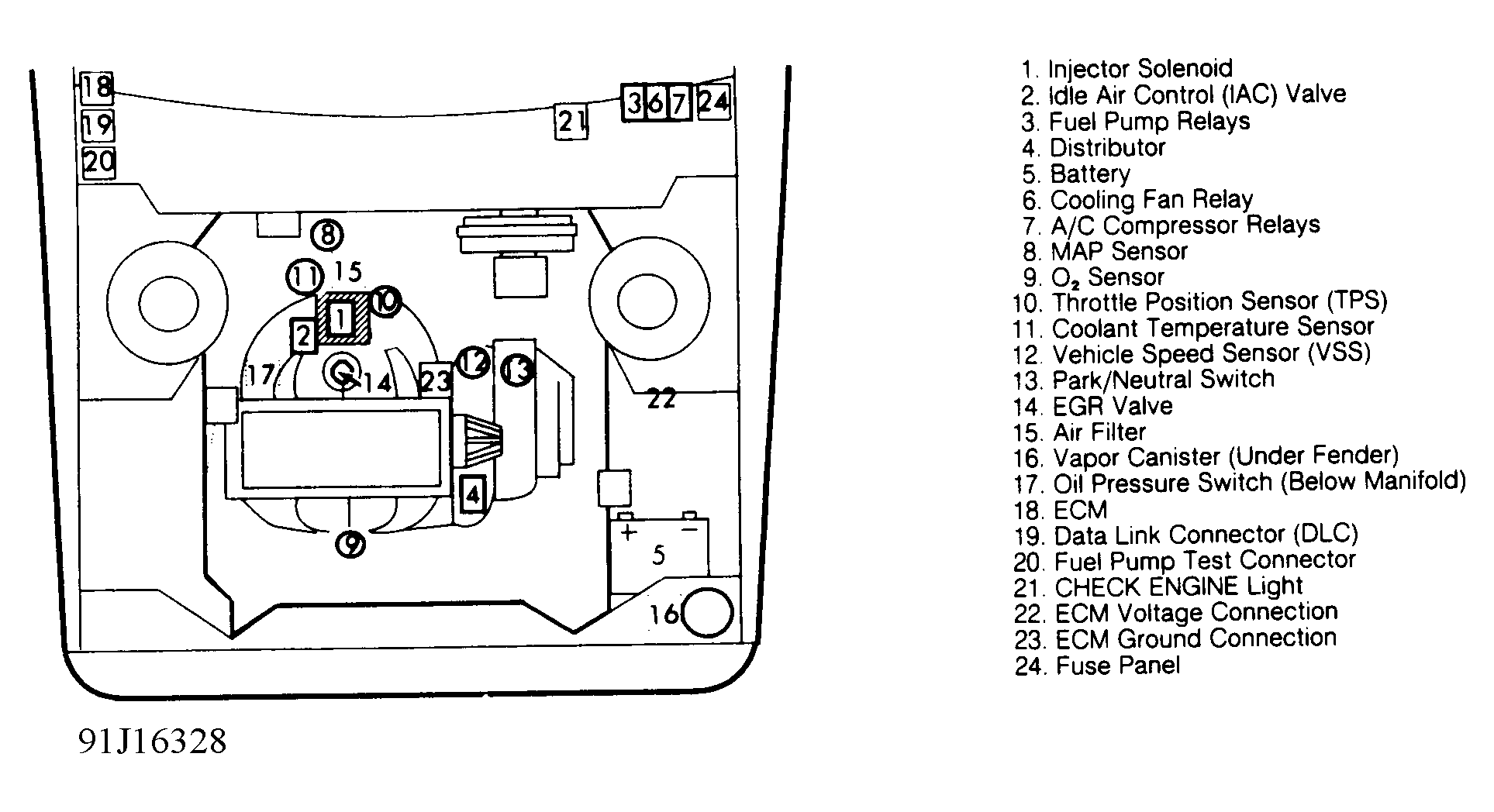 - Check for battery voltage at ECM terminals B1 and C16. If battery voltage does not exist, repair Red/Yellow wire from battery.