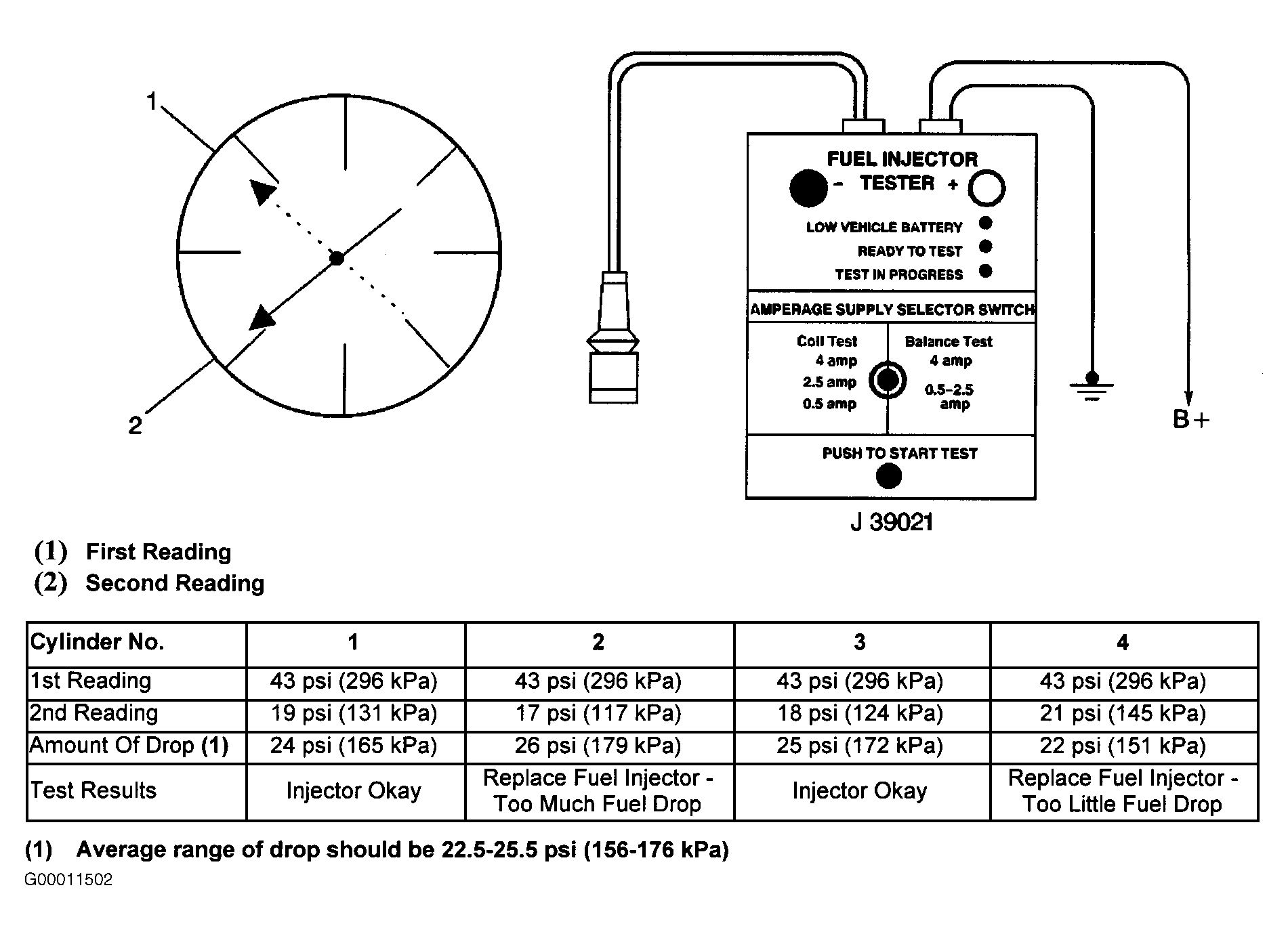 If pressure drop value for each fuel injector is within 1.5 psi (10 kPa) of average pressure drop value, fuel injectors are flowing properly. Calculate pressure drop value for each fuel injector by subtracting second pressure reading from first pressure reading. See Figure.