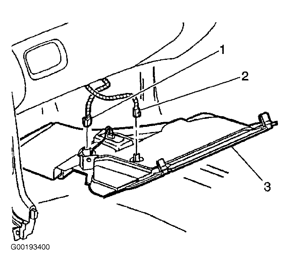 1. Remove fasteners securing closeout insulator panel (3) to instrument panel retainer. Remove push-in retainer to release closeout insulator panel from IP retainer. Turn heater temperature sensor (2) 1/4 turn counterclockwise to remove sensor from closeout insulator panel (3). Disconnect electrical connector (1) from lower IP courtesy light. See Fig 1. Slide closeout insulator panel rearward to remove from vehicle.