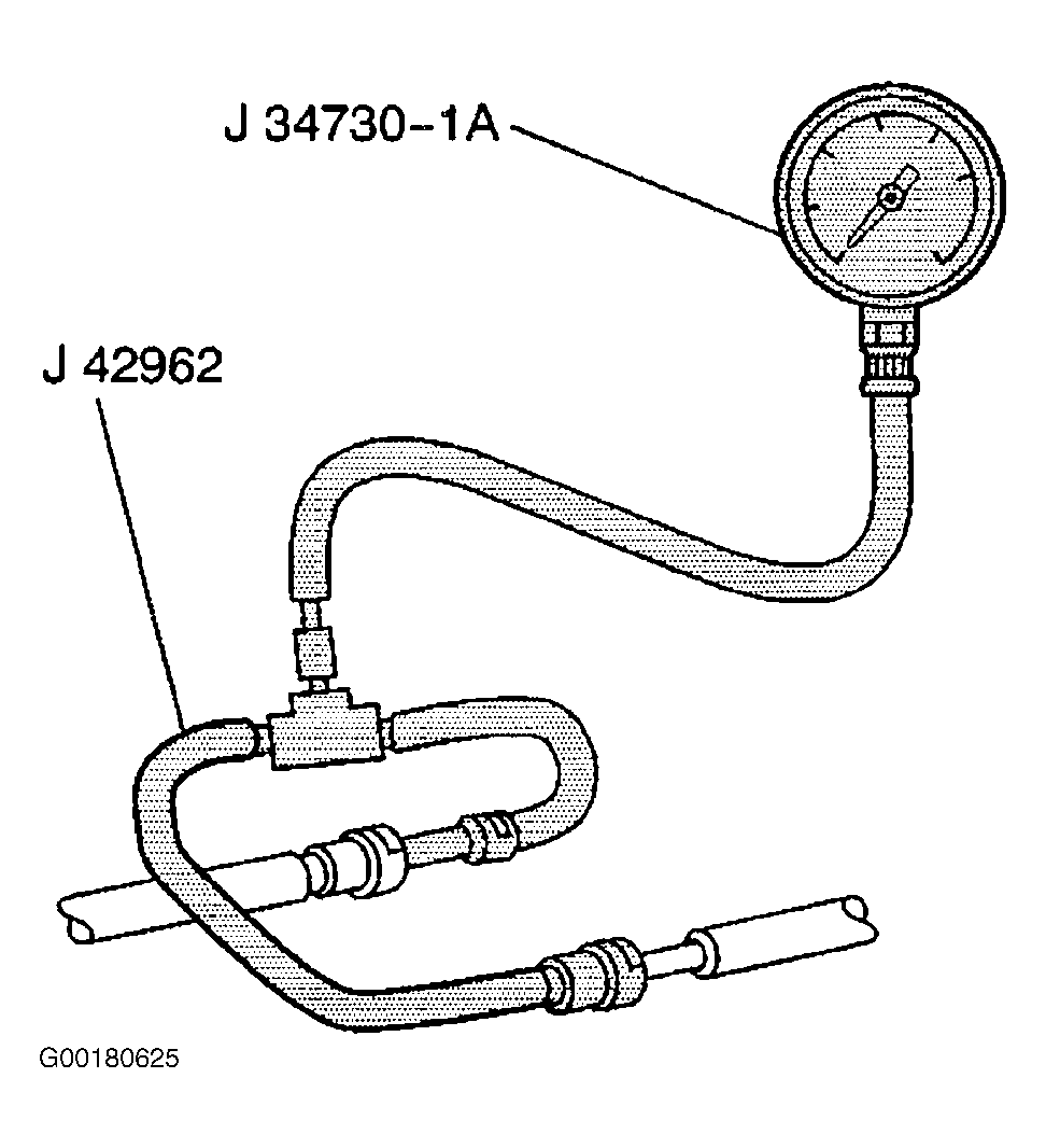 - Install Fuel Pressure Gauge (J 34730-1A) to fuel pressure gauge adapter, and tighten securely. See Figure .