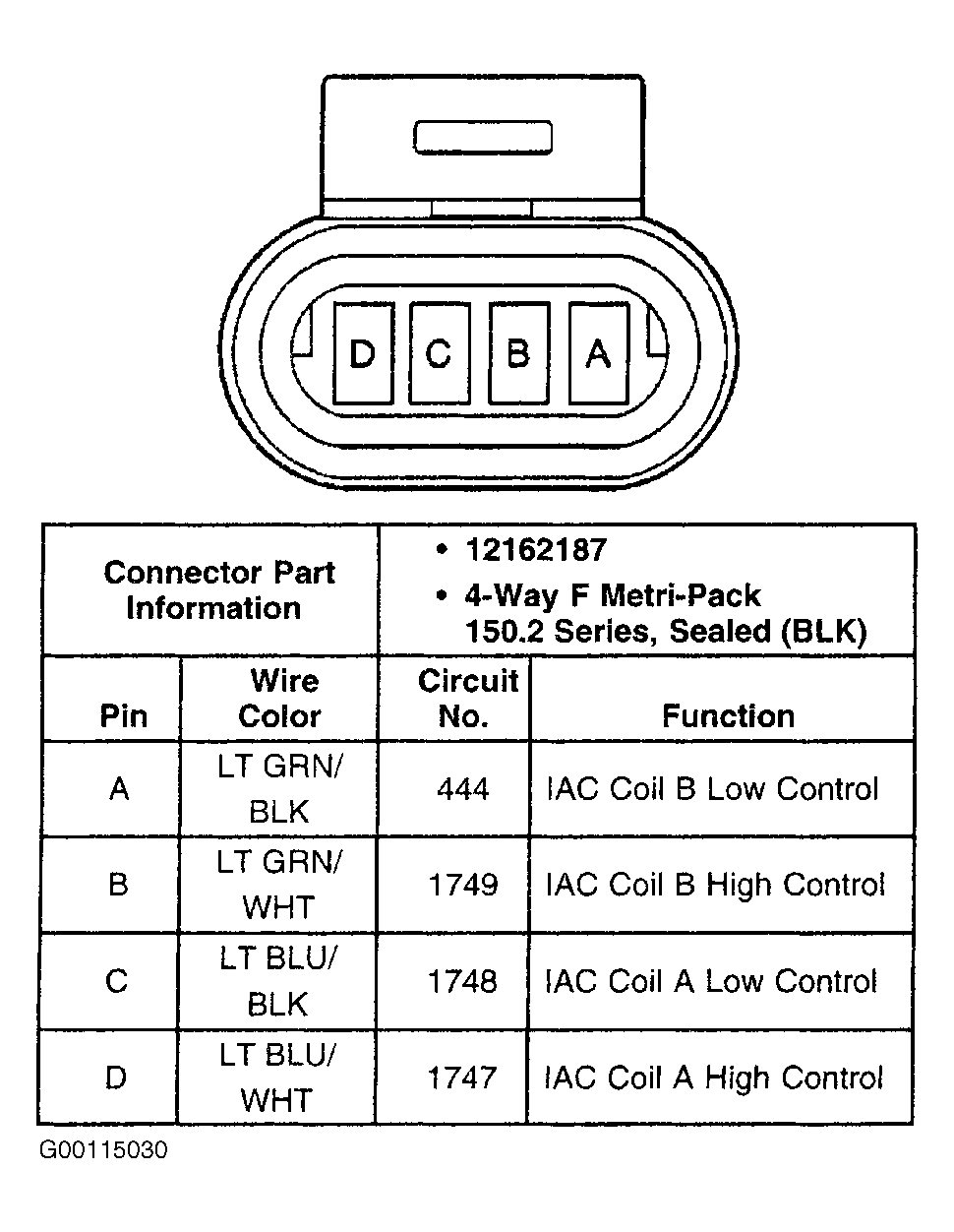 - Connect a test light between IAC coil "A" low circuit and IAC coil "A" high circuit at IAC valve harness connector. See Fig 1 . Using IAC system motor driver, command low RPM while observing scan tool until IAC counts start to increment, then command high RPM until IAC counts start to increment. Observe test light while incrementing IAC counts. Return engine speed to desired idle as indicated on scan tool data list. Repeat procedure on IAC coil "B" low circuit and IAC coil "B" high circuit. Did the test light stay illuminated, never flashing, while the IAC counts where incrementing during the test? If yes, go to next step. If no, go to step 17 .