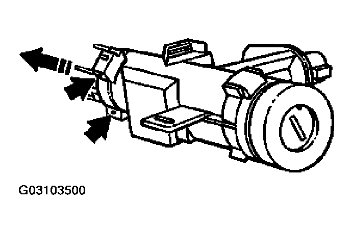 - Remove screw locking paint in the threaded bores of the two fastening screws (short arrows). Slightly loosen both fastening screws (short arrows) using special tool 9631 and pull the ignition switch out of the housing (direction arrow). See Fig 2