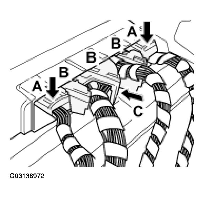 - Press in locking element -arrow- of plugs -B- and actuate latching lever -C- . See Fig 3 .