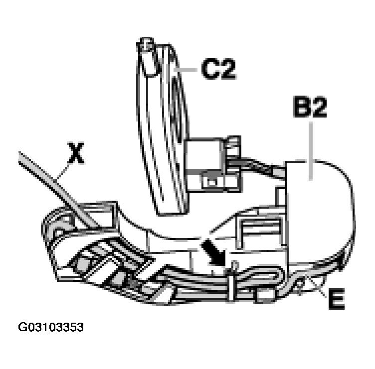 - When installing the new steering angle sensor -C2- for the first time in vehicles before model 2003, because of the modified plug connection (larger plug, position of plug and modified pin assignment), a new cable guide -B2- (instead of the old cable guide) together with an adapter lead -E2- must be fitted.