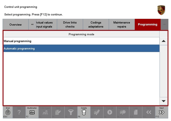5. Once the control unit to be programmed has been found, select the ==> 'Programming'  menu.