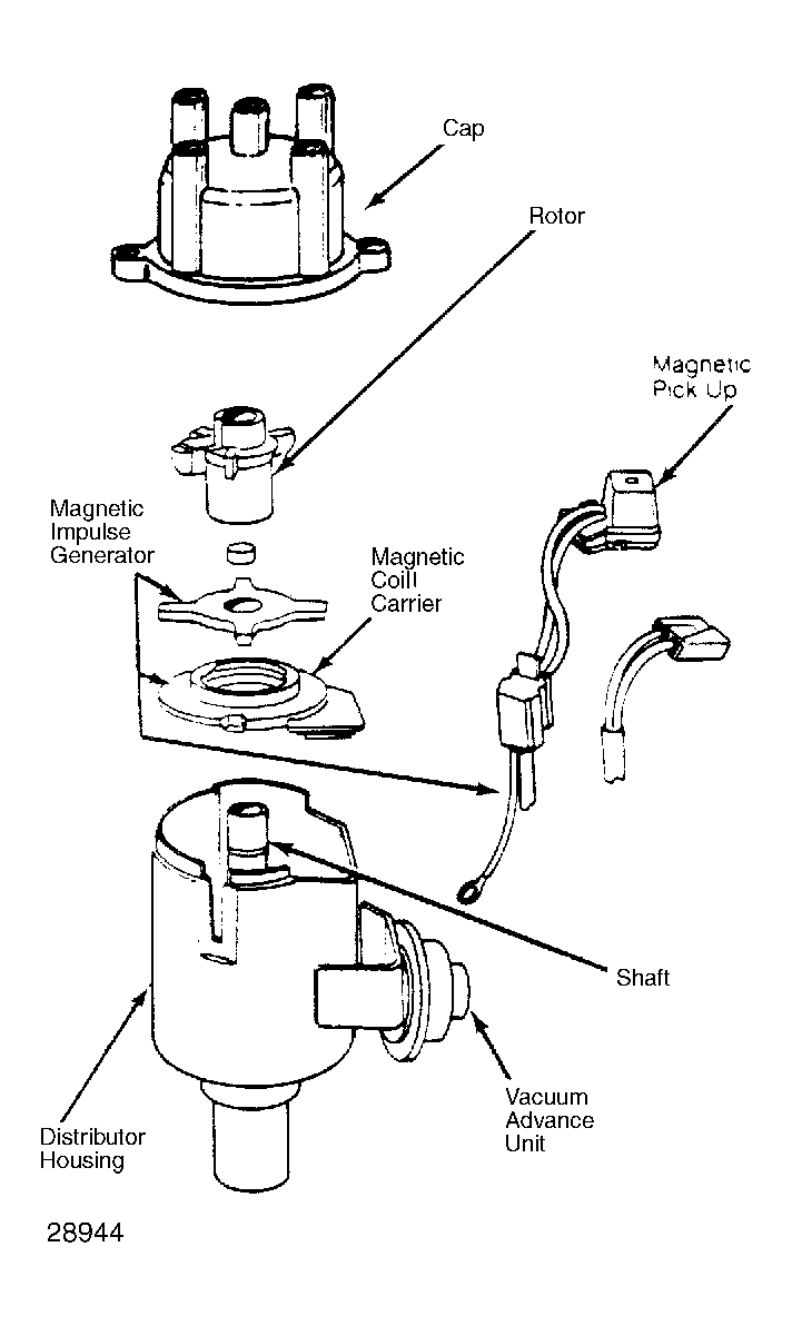 The distributor contains both centrifugal and vacuum advance mechanisms, a pick-up coil and a reluctor (polarity wheel). Refer to Fig 1. The ignition coil and amplifier module are mounted to a common light alloy base. The base provides both good grounding and cooling of the amplifier module.