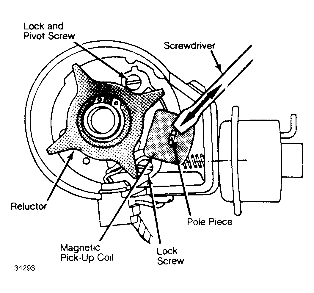 3. Alternately pass the blade of a magnetized screwdriver back and forth over the pick-up coil pole piece. A spark should occur at gap each time screwdriver passes pole piece.