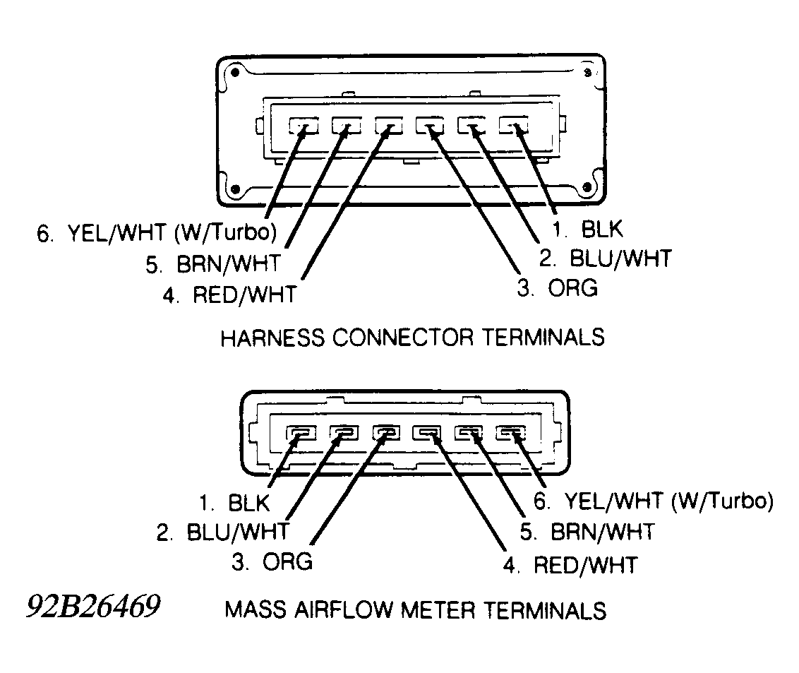 - Turn ignition off. Unplug connector from fuel injection ECM. Unplug connector from mass air-flow sensor. Connect DVOM to terminal No. 5 (Brown/White wire) at mass airflow sensor and ground. See Figure . Using a jumper wire, ground ECM harness connector terminals No. 20 (Violet wire) and No. 21 (Yellow/White wire). If fuel pump runs and DVOM indicates battery voltage, main relay is okay. If results are not as specified, go to step 2).