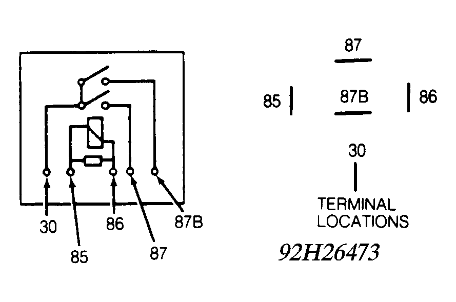 - Reinstall relay. Connect DVOM to relay terminal No. 87B (single Blue/Red wire on 900 Series; Green/White wire on 9000 Series) and ground. Using a jumper wire, ground terminal No. 85 (Yellow/White wire). Replace relay if DVOM does not indicate battery voltage.
