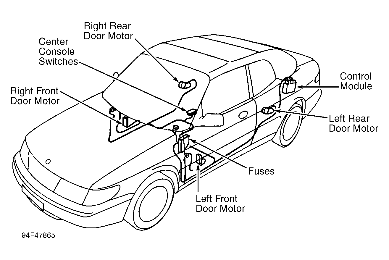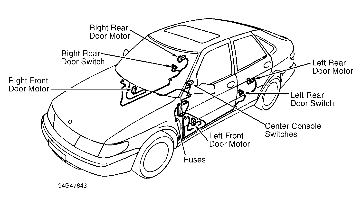 Power windows can be operated by switches in center console or, if equipped, switches in rear doors. Unlike rear door switches, switches in front doors have 2 positions for lowering the window and a third position for raising window. See Fig 1