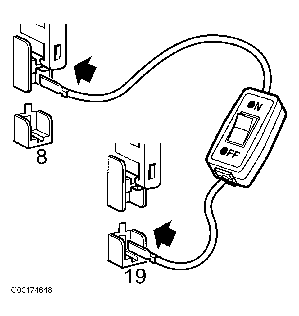 - Start the fuel pump by connecting Lead Fault Diagnosis, LH-System Diagnostics Cable (83 93 886) to the upper pin on fuse No. 8 and the lower pin of fuse No. 19.