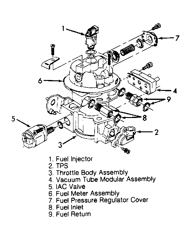 Remove fuel meter-to-throttle body retaining screws. Remove fuel meter assembly. See Figure. Remove and discard gasket. If fuel pressure regulator cover is removed, replace regulator diaphragm to prevent fuel leaks. Remove TP sensor and IAC valve. Throttle valve screws are staked in position and should not be removed.