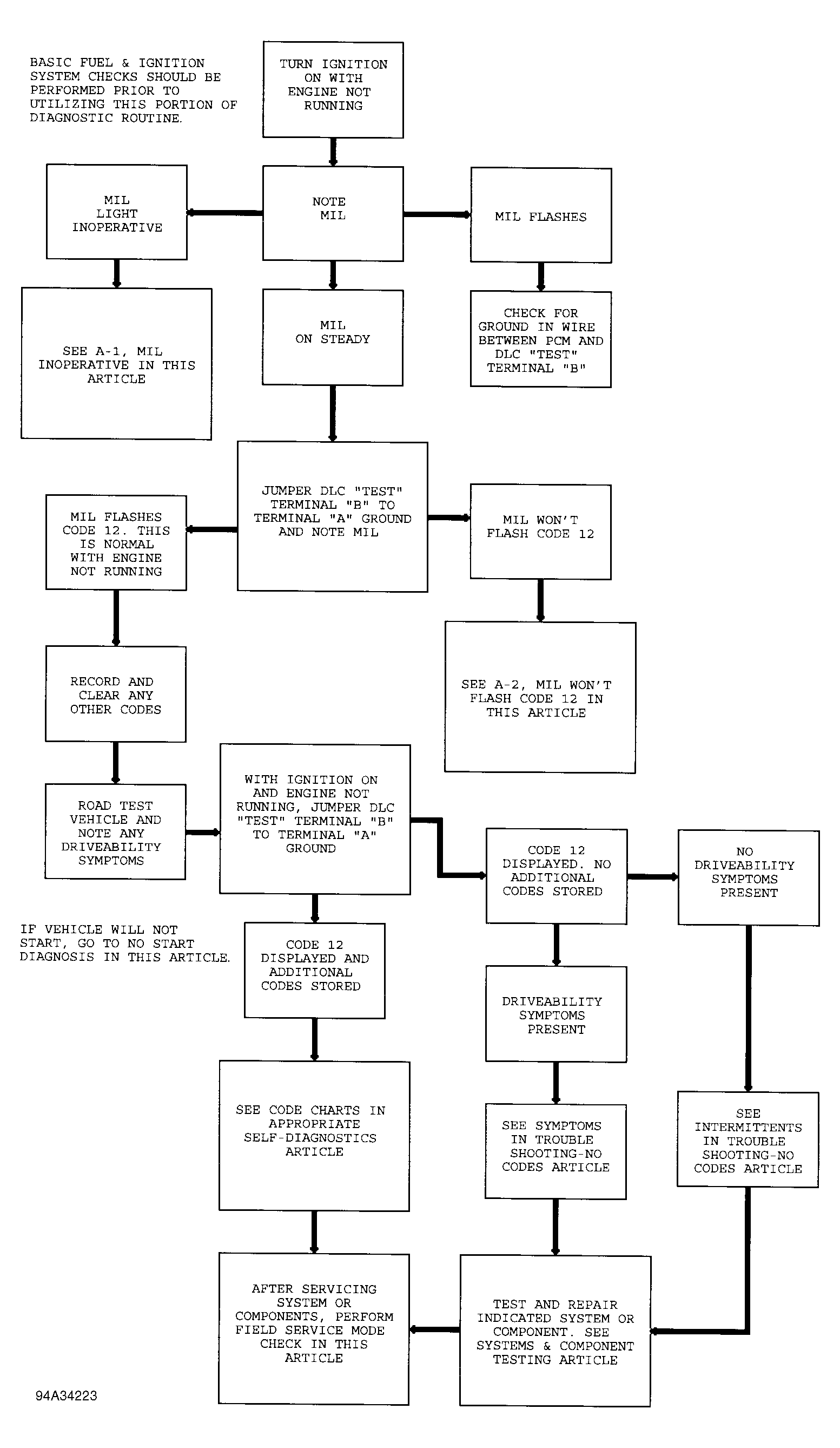After performing procedures in PRELIMINARY INSPECTION & ADJUSTMENTS, BASIC FUEL SYSTEM CHECKS and BASIC IGNITION SYSTEM CHECKS, this is the starting point for utilizing the self-diagnostic system for determining computer-related problems. See Fig 1 and Fig 2 . After performing necessary tests as described in the diagnostic circuit check, if no codes are indicated and driveability problems still exist, see TESTS W/O CODES article and SCAN TESTER USAGE in appropriate TESTS W/CODES article in the ENGINE PERFORMANCE section.