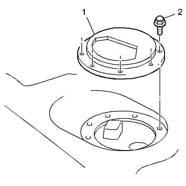- Install the fuel sender assembly hold down plate (1). See Figure.NOTE: Use the correct fastener in the correct location. Replacement fasteners must be the correct part number for that application. Fasteners requiring replacement or fasteners requiring the use of thread locking compound or sealant are identified in the service procedure. Do not use paints, lubricants, or corrosion inhibitors on fasteners or fastener joint surfaces unless specified. These coatings affect fastener torque and joint clamping force and may damage the fastener. Use the correct tightening sequence and specifications when installing fasteners in order to avoid damage to parts and systems.