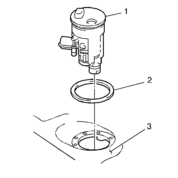 - Position the new fuel sender assembly O-ring (2) on the fuel sender assembly (1). See Figure.