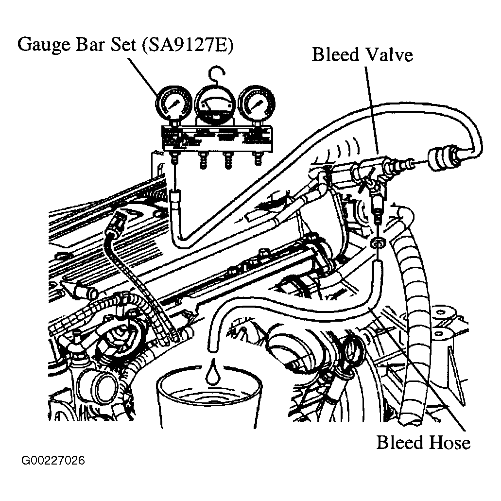 - Place the bleed hose of the gauge bar set or fuel pressure gauge into an approved fuel container.