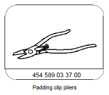 | 15 | Hook in new wire rings (10) on staple wire (7) of seat backrest padding (12) and close completely with upholstery clip pliers (arrow B). | Fig 2 | |