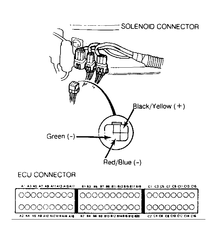- If no vacuum is present in step 5), disconnect solenoid connector at firewall. Check for battery voltage between Black/Yellow terminal and Green terminal. If battery voltage is present, replace by-pass control solenoid valve B. If no voltage is present, proceed to step 14).