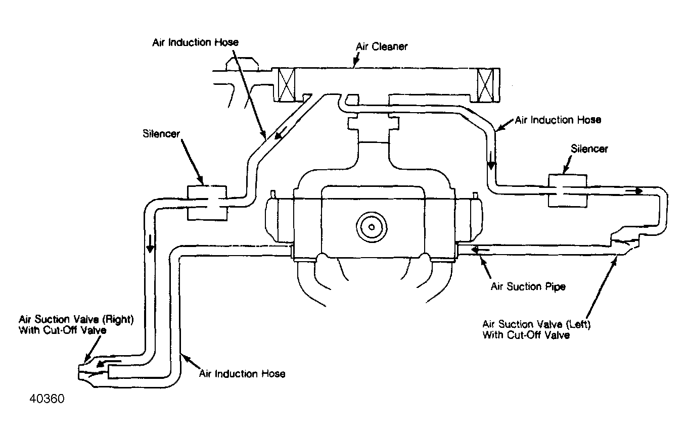 Secondary (fresh) air drawn from the air cleaner is supplied to the exhaust ports of both cylinder heads. Also, a constant supply of secondary air is supplied to the exhaust port near the upstream portion of oxidation catalyst by ASV (rear). The ASV (rear) is mounted on the exhaust pipe and uses no cut-off valve. See Fig 1 .