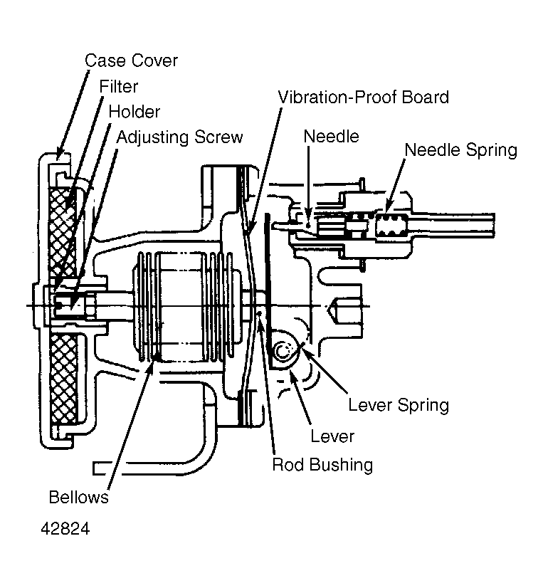 Above 4000 feet (1200 m) the bellows in the altitude compensator is expanded and then the lever pushes the needle valve to allow additional air passages to open the control air passages. Air coming into the carburetor through the altitude compensator is metered and supplied to the control passages. This compensates overall air/fuel mixture of the carburetor. See Fig 1 .
