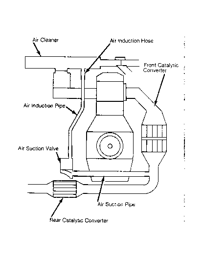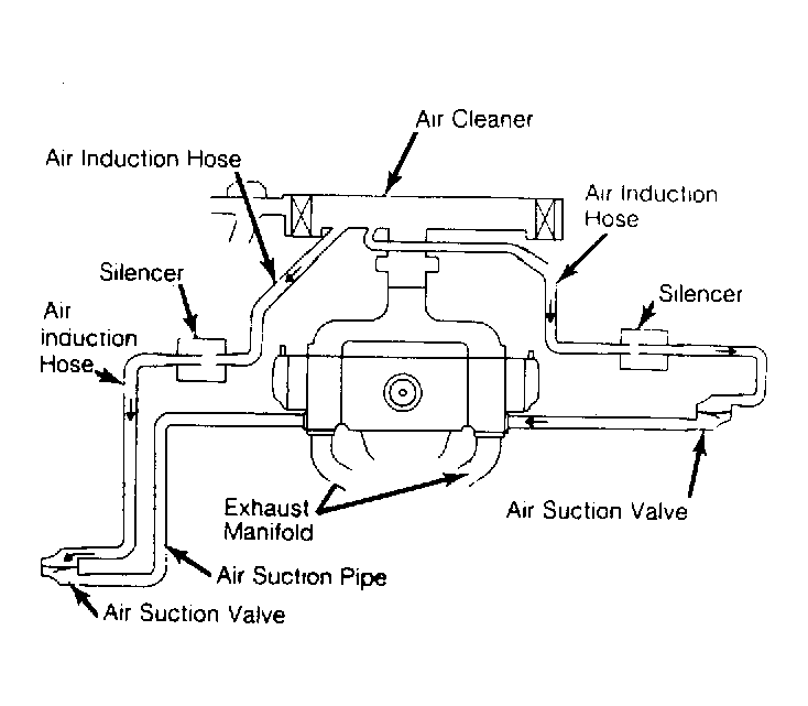 Negative pressure from exhaust pulsation reaches suction valve through suction pipe. This causes reeds in suction valve to draw open. Secondary (fresh) air from air cleaner is drawn through silencer(s) and into exhaust passages. See Fig 1 or Fig 2 .